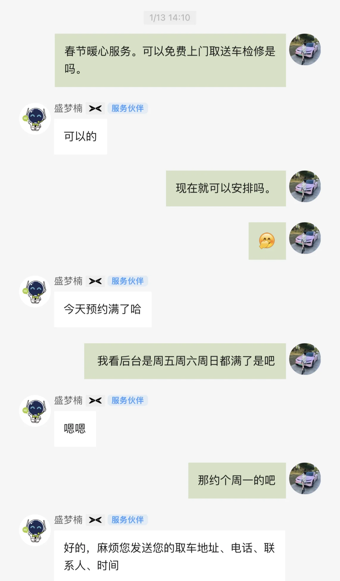 决定要去后,就看到了可以免费上门取送车,正所谓瞌睡就来了枕头,更完美了,这下一点都不用麻烦了,赶紧去服务群询问。