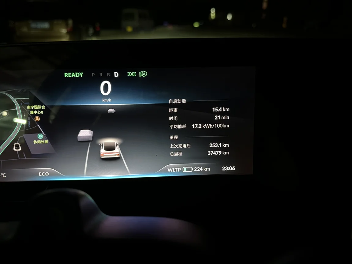 测试地点是广西南宁市至广西宾阳县来回,中间有几十公里的市区路段,充电前表显224KM,出发前充电100%,表显续航WLTP 576 KM,行车速度高速平均在115公里,市区平均在65公里,测试结果续航为253.1km,表显剩余224KM,回到测试的的剩余里程,其中170公里的高速,83.1公里左右的市区道路。续航达成率71.9%。
