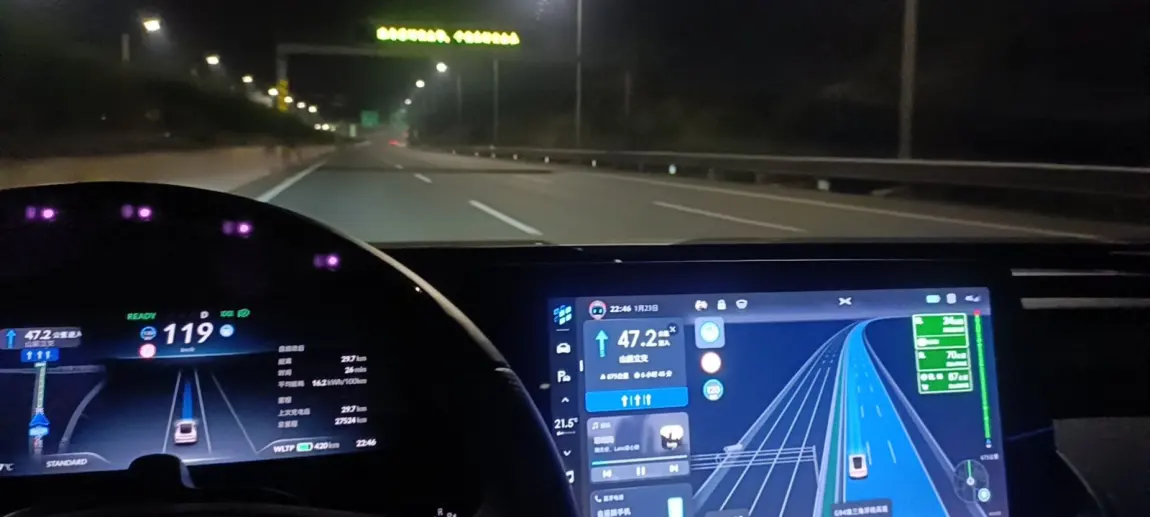 充完电就上高速一路狂奔,大年初二晚上高速真的太爽,基本上没车。当时考虑买小鹏很大一个因素就是它的辅助驾驶(即NGP功能),上图的车机就是开启NGP后的界面,全程辅助驾驶简直不要太爽了,自动超车,在变换高速前车子自动变道进闸道,全程我只要扶着方向盘和留意路况就可以了,完全不用担心走过了高速口走冤枉路,驾驶非常轻松舒适,不觉得劳累。对于小鹏的自动辅助驾驶,我是知道何总是投入很多研究费用去研发的,因为我是做知识产权工作的,也会通过它们的专利了解到它们的技术原理和应用,确实在国内是顶尖的,绝不比特斯拉弱。另外,屏幕右上边绿色框框就是显示将要到达的服务区,上面会显示距离服务区的公里数和是否有充电桩,非常的清晰方便。但是,这里说一下小缺点,在广连高速那一段路可能是车机地图没有更新,上面显示的服务区都没显示能充电,但其实我经过服务区的时候是有看到有充电桩的,希望小鹏工程师注意更新一下。