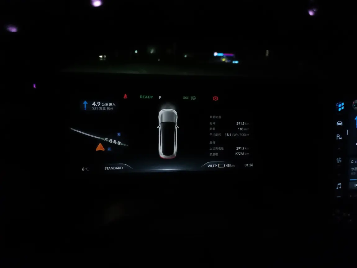第一次充电,跑了三个小时,走了291公里,剩余续航wltp48,能耗18。对于这个续航还算是挺不错的,因为时速120公里是比较耗电的。