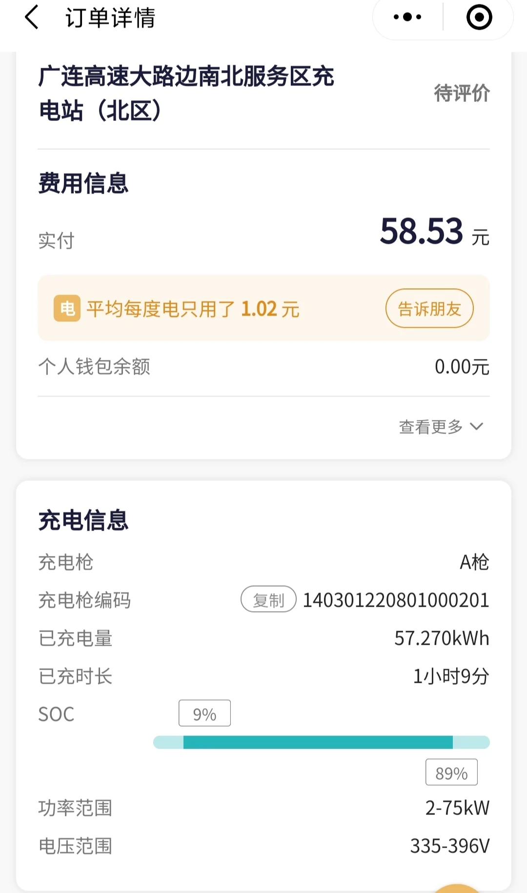 接下来跑了两个多小时,跑了250公里,已经到了衡阳了,续航还剩wltp60,能耗19。这一段路因为在彬州那段路气温低,而且又下大雨了,所以能耗相对高一些,能跑的公里数也会少一些。这里需要点赞一下,原本服务区只有一个充电桩,但是国网特意放了一辆充电车在这里,可供4台车充电,毫无充电焦虑。这里充电需要下载e充电APP才能充电。充电时间也是一个小时左右充到90%,总费用65元比第一次贵了几块钱。