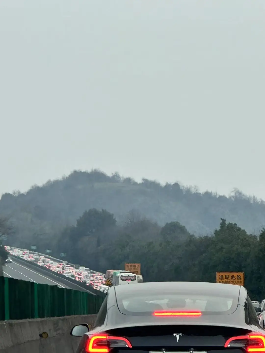 因为初六了,好多人都堆积在今天回程,一上高速就开始堵车了。这时候心情确实还是有点焦虑,网上都说电车最怕在高速堵车,究竟我会不会遇到这种困境呢?此时心情又刺激又紧张,哈哈😃