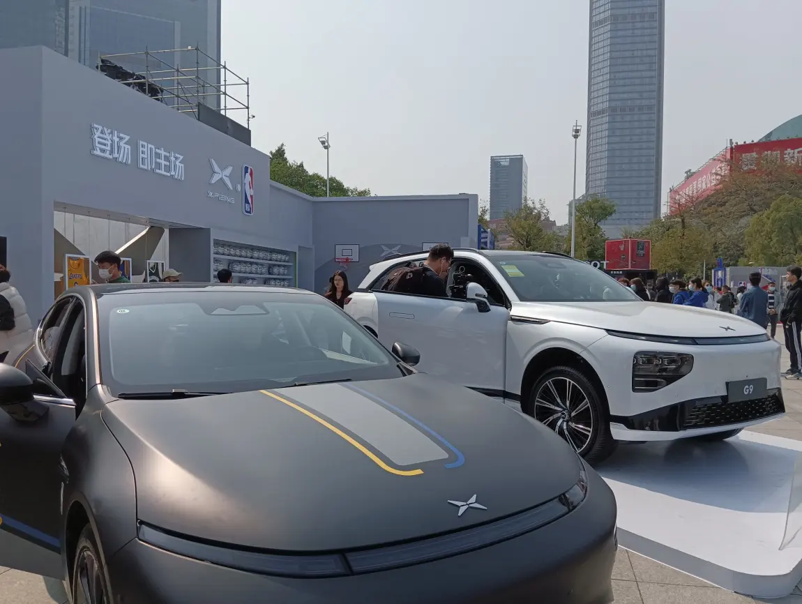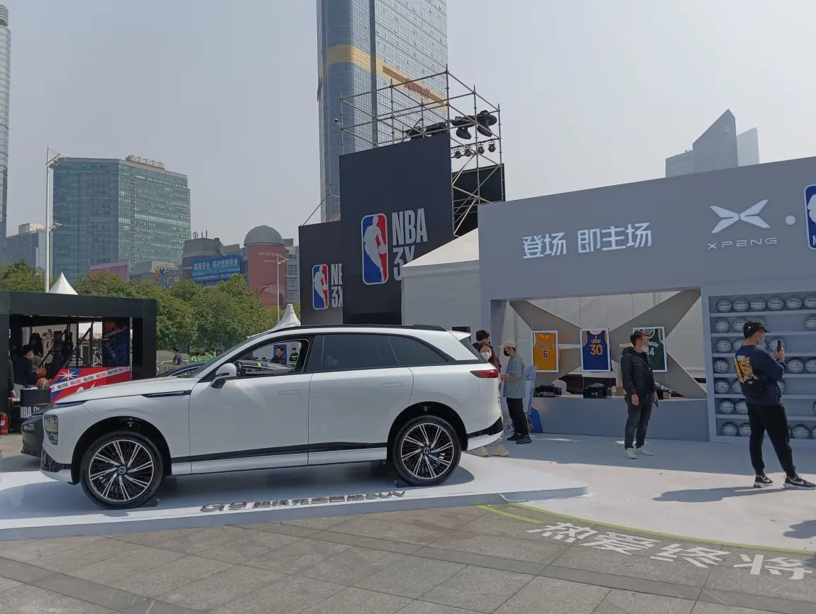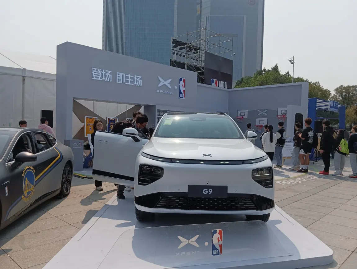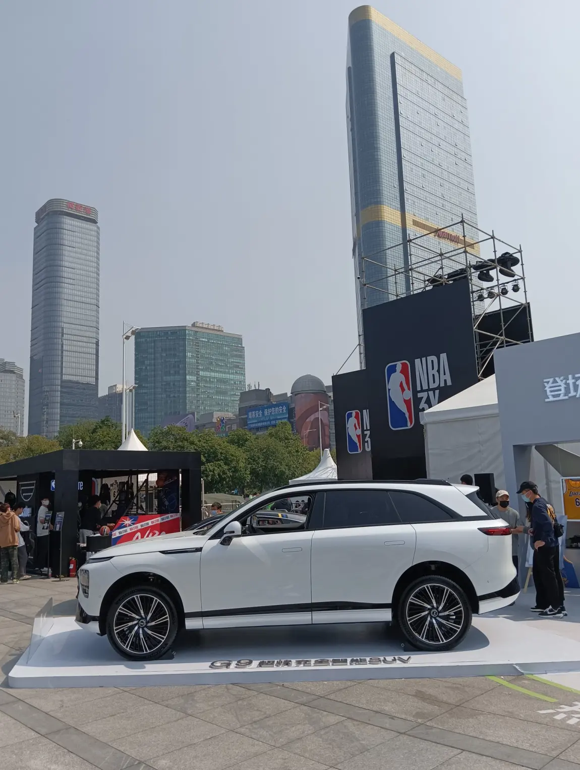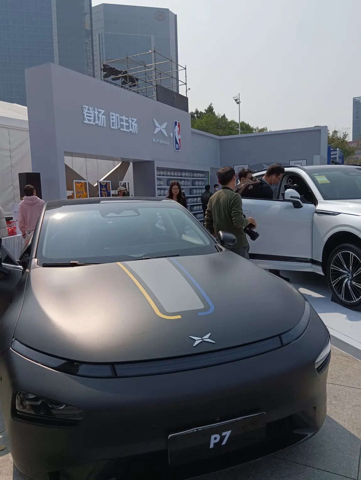 🌻我14点来到现场,在露天广场显眼的位置找到了小鹏展位,现场放置了一辆贴有NBA勇士队logo的车膜的P7,一辆白色的G9,吸引了好多人围观和体验。
