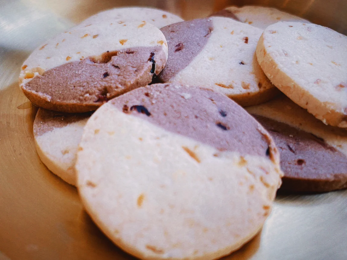 肉眼可见的蔓越莓果肉个橙子的果肉,这个双拼的颜色也很好看,看上去就是让人很想咬下去的感觉~这个曲奇饼干可以正片吃就是两种不同的风格香气在口腔里面发挥,也可以掰开来单独吃!看鹏友们自己喜欢的口感做选择吧~🤩🤩