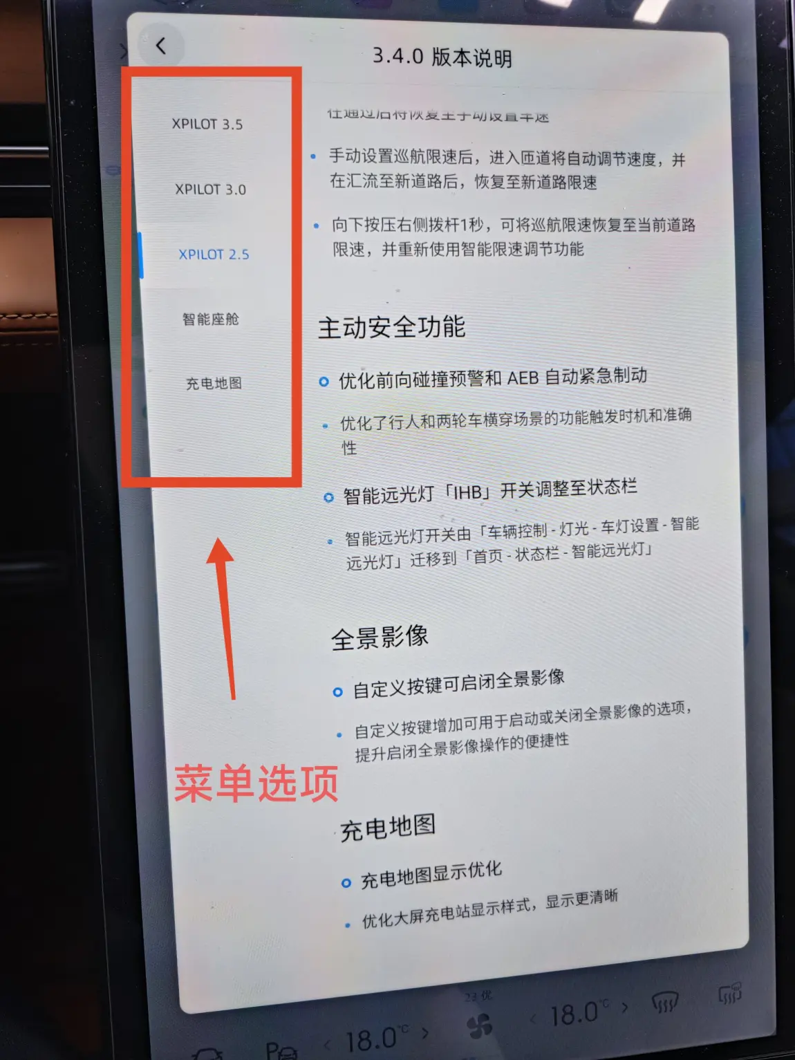 很多车主只知道车机系统更新了,不知道更新了什么,最主要是不同车型、软件版本的车主,如何知道针对自身车辆更新了什么。这时候你不用面对巴拉巴拉一大堆的更新清单,只需要点击车子最上方小鹏“X”logo➡️弹出界面中点击“查看版本说明”。这时候就会出现Xpilot3.5、3.0、2.5、智能座舱、充电地图五个选项。前三者你根据你购买的软件版本选择。后两者是通用更新,如果你是G版车型直接看最后两个,如果你跟我一样E版且没有购买任何软件,看最后三个选项就好。