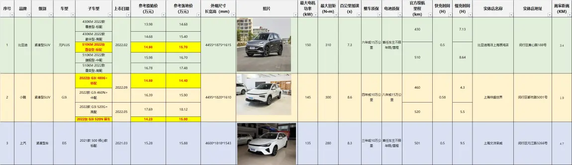 当时在15万±2万的范围里,筛选出来了元PLUS,小鹏G3i,荣威Ei5这3台车,其它还有一些车型符合,但是搜了下距家半径5km里有可以看车和试驾的只有这3台车,于是第三步,可选车型确定。