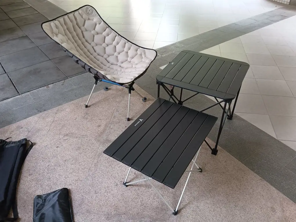 🌻折叠桌是露营必不可少的工具,用来放一些食物、茶具、餐具、蒸煮设备等。我之前买过两种,一种是铝合金支架+牛津布桌面的,一种是铝合金支架+铝合金桌面的,前一种牛津布桌面决定了桌面是不平的,也不耐热,不适合放蒸煮设备以及放一些重物,放弃后送人了。第二种是当前在用的,下面拿来对比这次体验的小鹏铝合金轻便折叠桌。