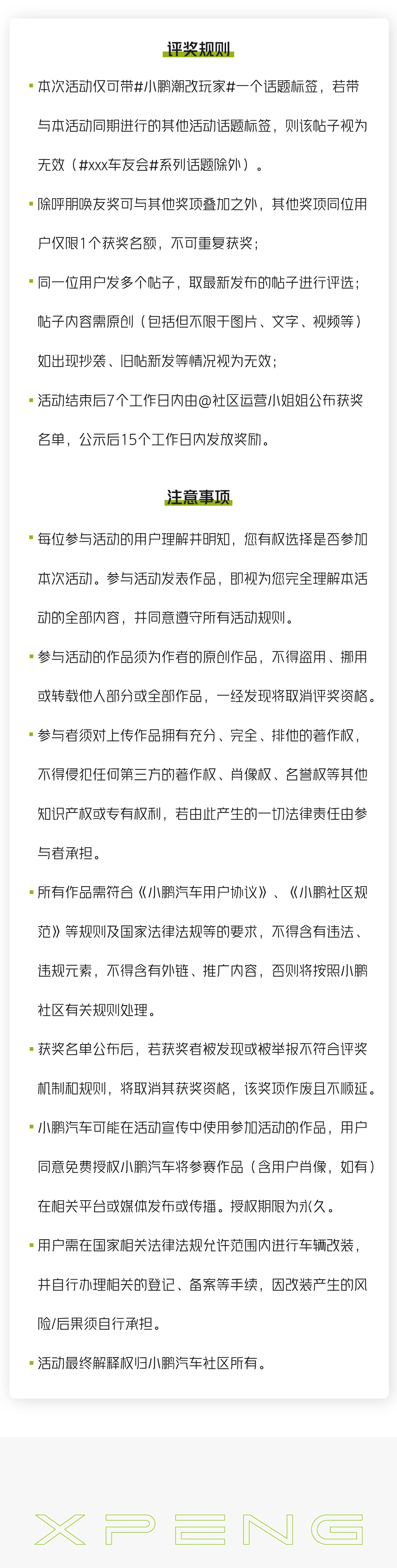🎨活动要求:带话题#小鹏潮改玩家#发布图文帖,分享你的改装经验、改装效果和给爱车改装后的心情;帖子内容文字≥100字,图片≥4张。