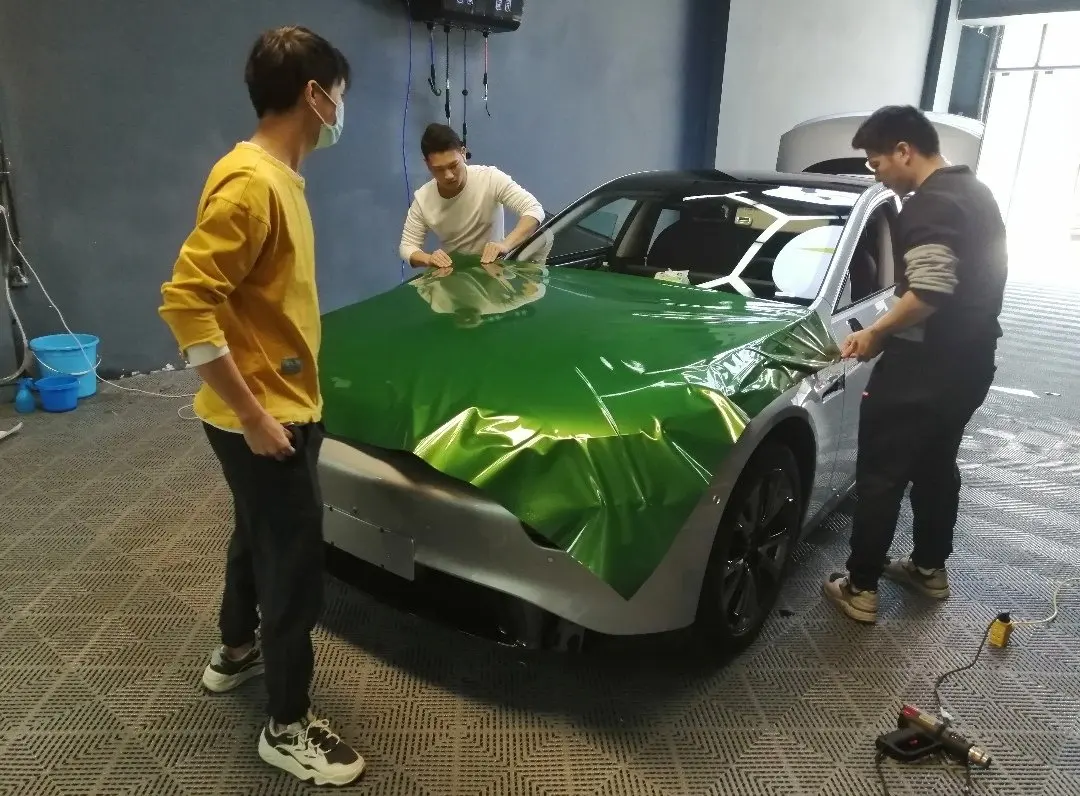 3个小哥哥一起把车头盖贴好之后就开始分工各自贴两边的车门,和车尾箱盖