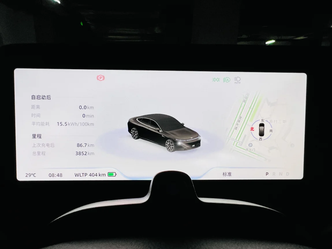 出发wltp495,回家后剩下409,总行驶86.7km。总体来说p7i城市道路还可以做到1:1的续航,甚至反向虚标,期间有停车未锁车导致电量损耗的情况。