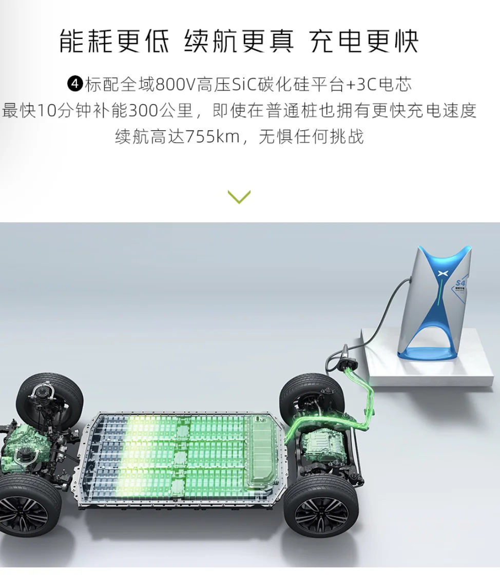 小鹏G6和他的大哥G9一样采用全域800V高压碳化硅SiC平台+3C快充电芯,即便使用第三方社会充电桩也可更快充电,外出充电速度也有了保证。