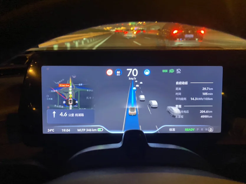 虽然我选的是后驱版的P7i,动力表现还是非常棒的,官方说是零百加速6.4秒,但很少有机会去测。市区通勤基本上都是标准模式+高动能回收,红绿灯起步一脚下去大概40码左右,能耗大概12~14左右。高速上偶尔切换成运动模式,体验一下速度与激情,运动模式的电门非常灵敏,轻踩一下推背感十足,丝毫不比油车的驾驶感受差。