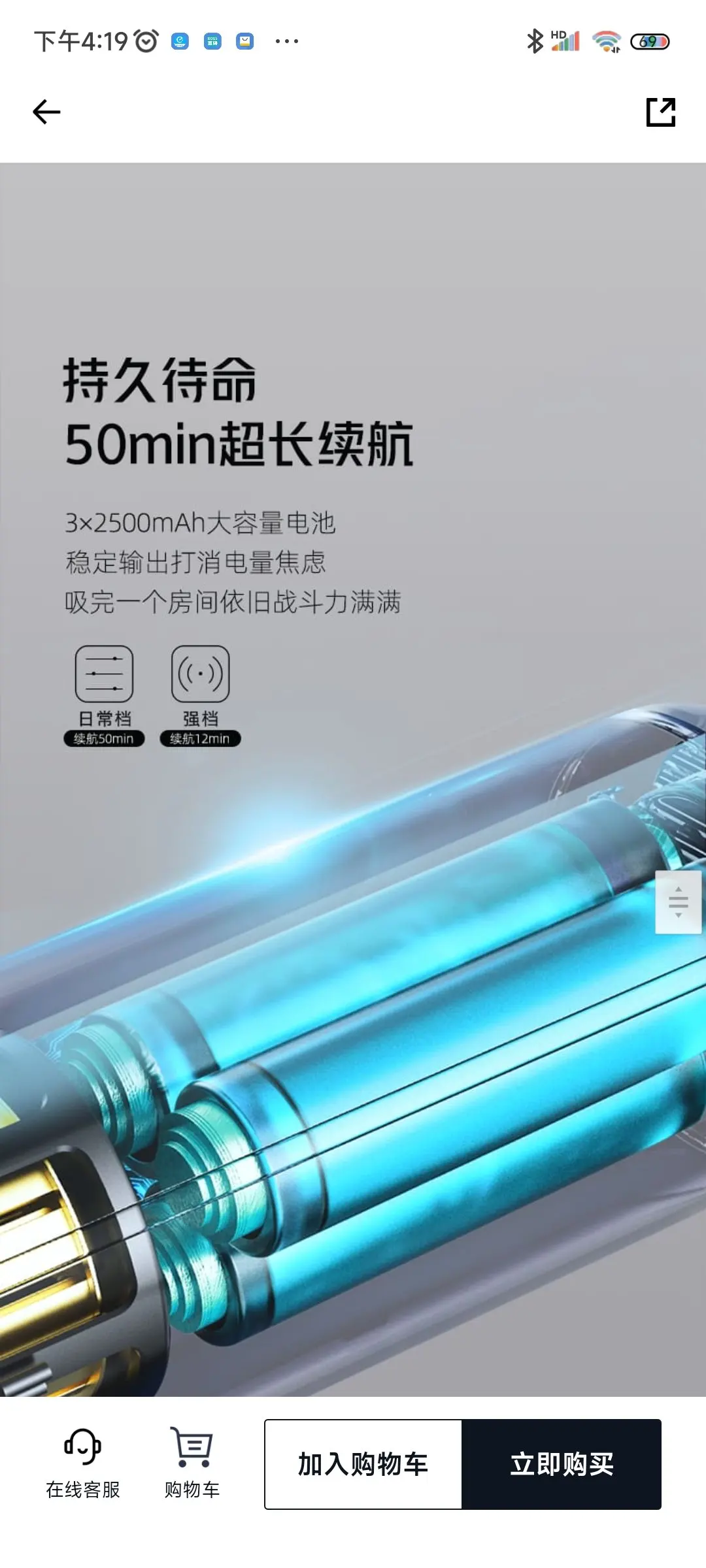 日常吸尘用弱档模式就够用,一次可以续航50分钟,总体来说还不错。 吸尘的同时可以紫外线杀菌,这个功能非常人性化的,使用的时候只需要按下UV按钮,就可以开启紫外线灯,实时清除 尘盒里的细菌。