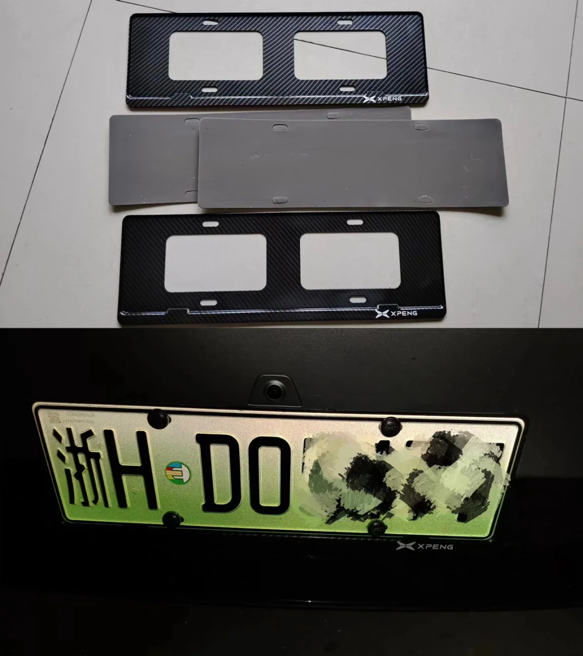 车牌到了,直接装未免有些单调,小鹏专属的车牌架必须得配上,铝合金材质、碳纤维纹理,还能防止车牌边缘勾到裤子或者被人恶意掰弯。因为边框很窄,所以不影响雷达,仅仅前视摄像头挡了窄窄的一条缝,问题不大,PDD活动价不到20。