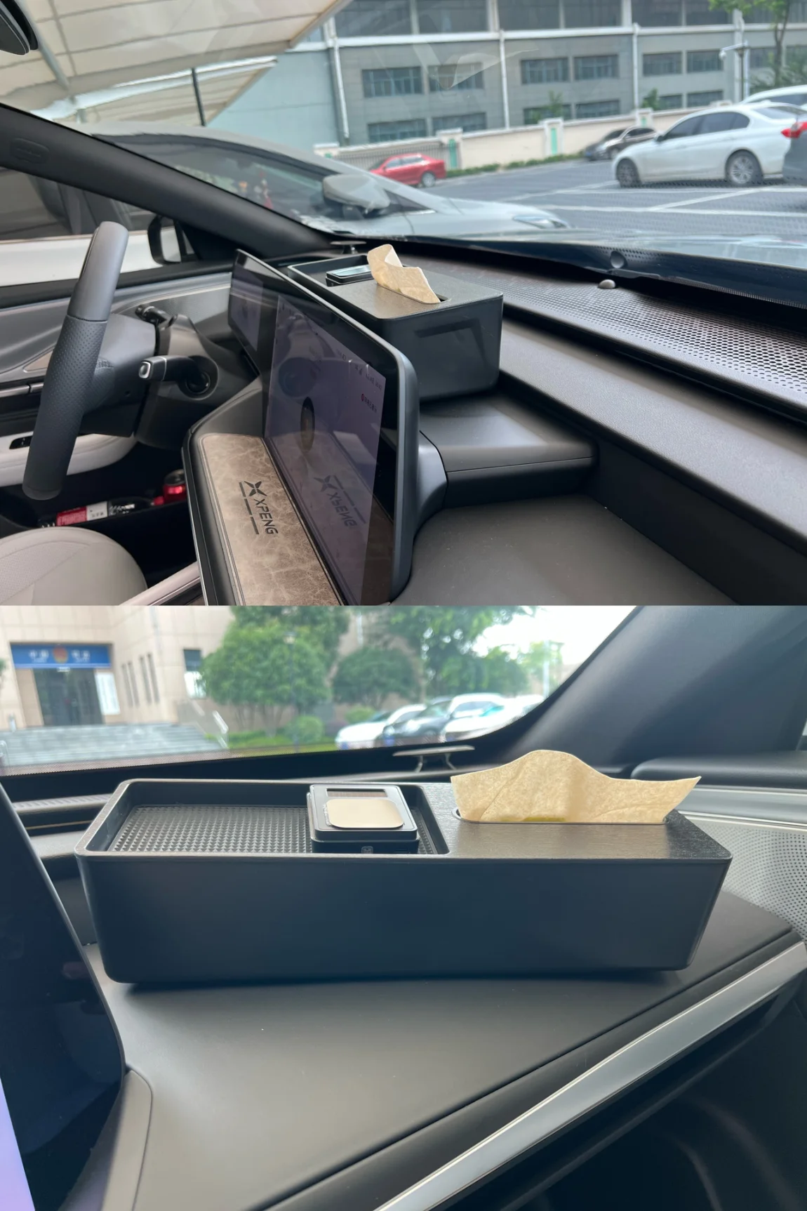还有强烈推荐的这款屏后储物盒,原先我抽纸放在屏幕后面,一个急转弯滑来滑去,有了它,稳如老狗。里面有两个格子,可以放抽纸还有其他的一些小物件,比如行驶证、驾驶证之类的,空间还挺大的,上面橡胶防滑垫上可以放ETC,就不用丑丑的粘在玻璃上了,PDD活动价74左右。