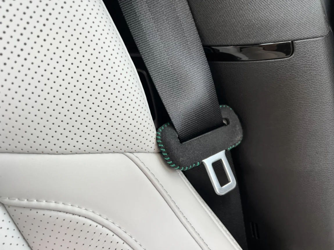 安全带卡扣保护套,提升颜值的同时还能保护B柱塑料,翻毛皮材质+绿色缝线,反面有双面胶固定,两个12左右。