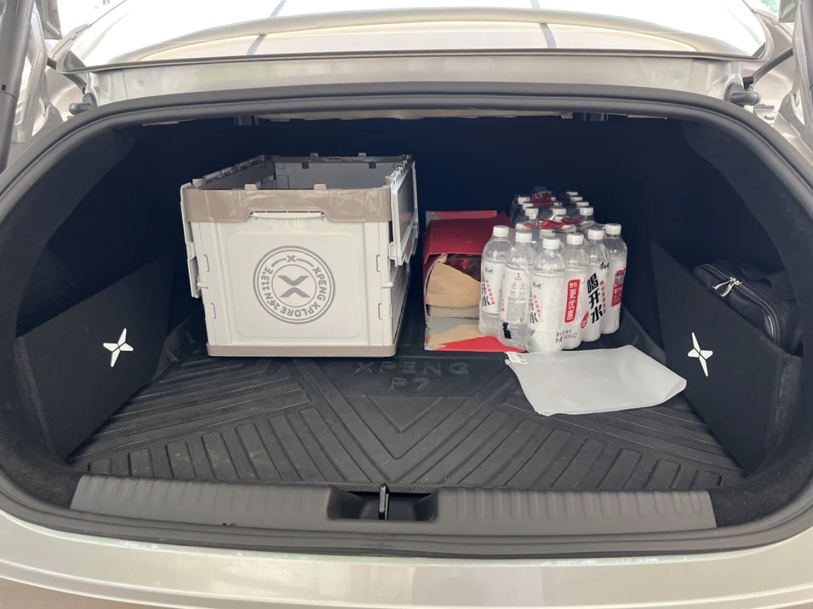 后备箱隔板+TPE尾箱垫,还有小鹏活动薅的折叠储物箱。放在后备箱,那就无所谓了,怎么便宜怎么来,两块隔板7块6,TPE尾箱垫40出头,还挺好用的。