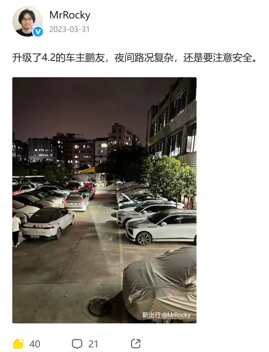 总的来说,4.2.0的推送,让小鹏车主第一次感受到了如此高等级的智能辅助驾驶。3月31号推送的那个晚上,多少车主连夜升级,半夜出去体验的。以至于@MrRocky 连夜发了条动态提醒大家注意安全。