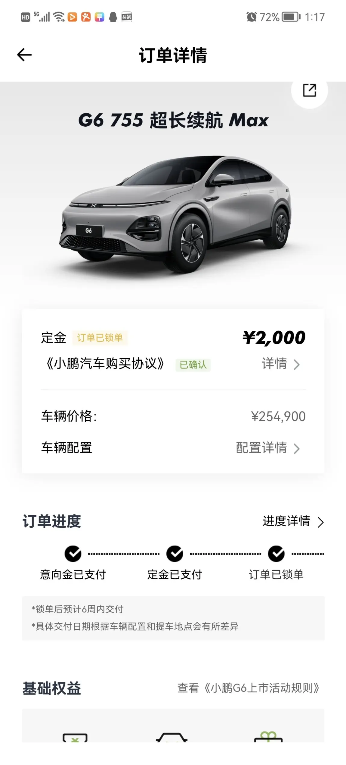 #与小鹏G6一拍即合# 购买理由:盯着这个车车已经接近2个月了,这半年了解了所有的电车,做了综合对比分析,到最后发布价格那一刻,我就给他贴上了应有的标签。20-35万内性价比战斗力最强的一款车。1:续航和能耗,只有特斯拉能和他比划比划。2:空间和尺寸,城市里开我觉得车越小越好,车内乘坐感受越大越好,这车车完美结合在一起了。3:智能化,实际感受了,他要说第二我觉得别人也不好意思说第一,而且这还是现货还是一次到位的全货,后期还会增值的货。4安全:我也对比了其他的设计,这车车把能给的都给了,把别人没有的技术也都标配了,还能说啥,而且我最看重的空气质量这一点点味道都没有。5:当然也要叨叨点不好的,我喜欢小鹏的升降音响,这家伙给阉了,选配也行啊,多有仪式感,对老客户太友好了权益很多,新客户略显小伤。最后一个是氛围灯可以再做绚丽点,也花不几个钱,不行就选配。总结:没有完美的车,但这个各方面是最合适最合适的了。