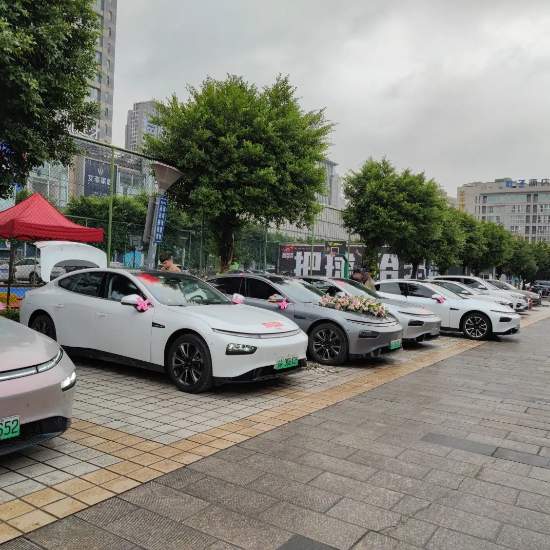 这就是我们当时结婚朋友群里面帮我们借的小鹏P7车队。其实现在看来,当时这个车车队在这条街还是挺亮眼的。