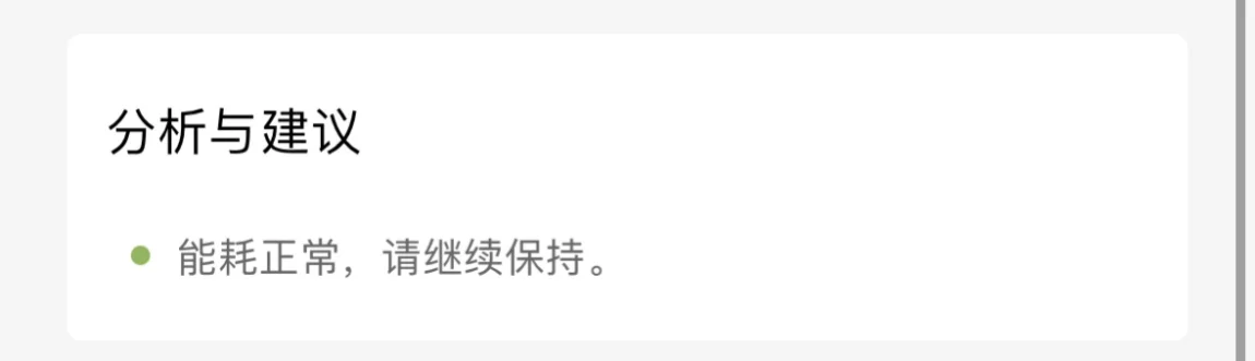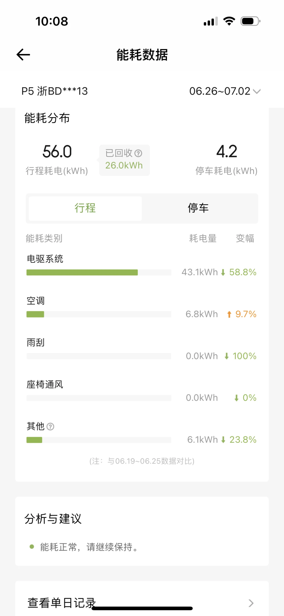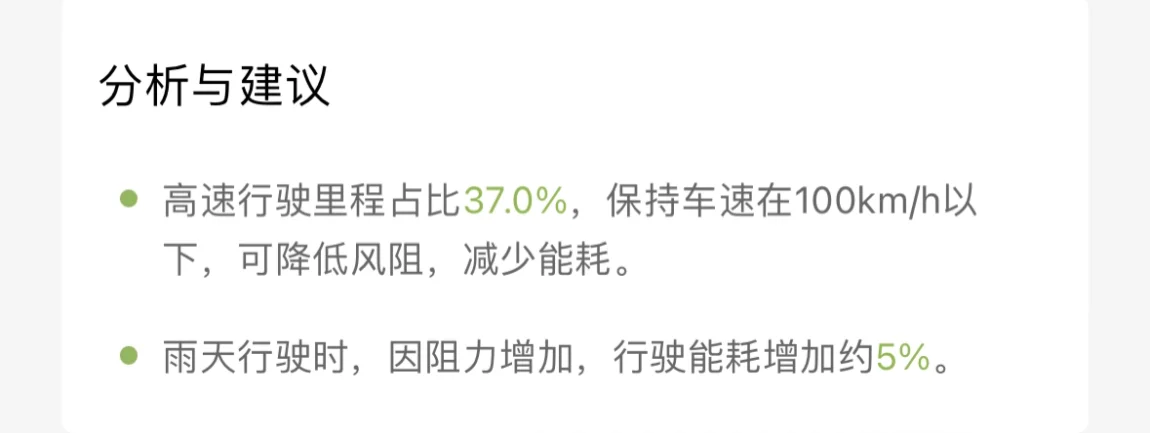 3️⃣针对车主每周的能耗数据,官方会给出分析与建议,如:能耗正常,请继续保持;雨天行驶时,因阻力增加,行驶能耗增加约5%;高速行驶里程占比37%,保持车速在100Km/h以下,可降低风阻,减少能耗等等,这一项也挺好。