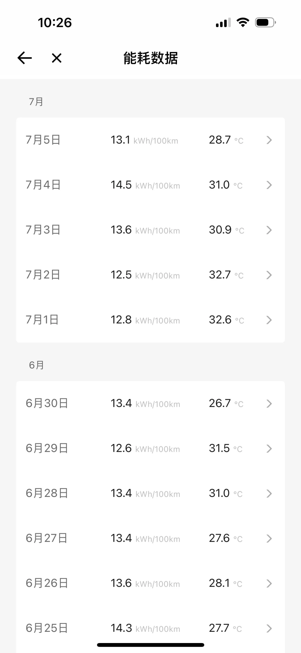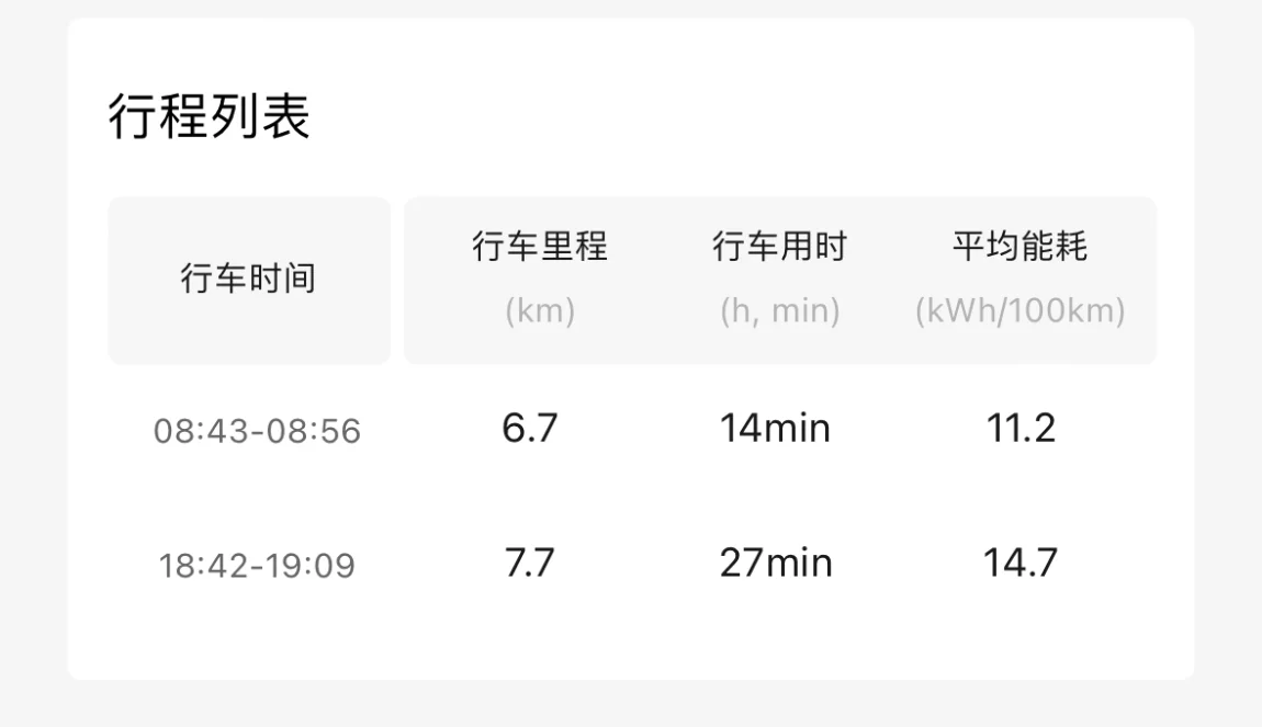 4️⃣可以查看单日纪录,每天的电耗和气温,点击日期,也能看到当天的能耗数据,对行程做了个列表,几点几分行车,行车多少里程,用时多少,平均能耗,数据统计还是挺全的。