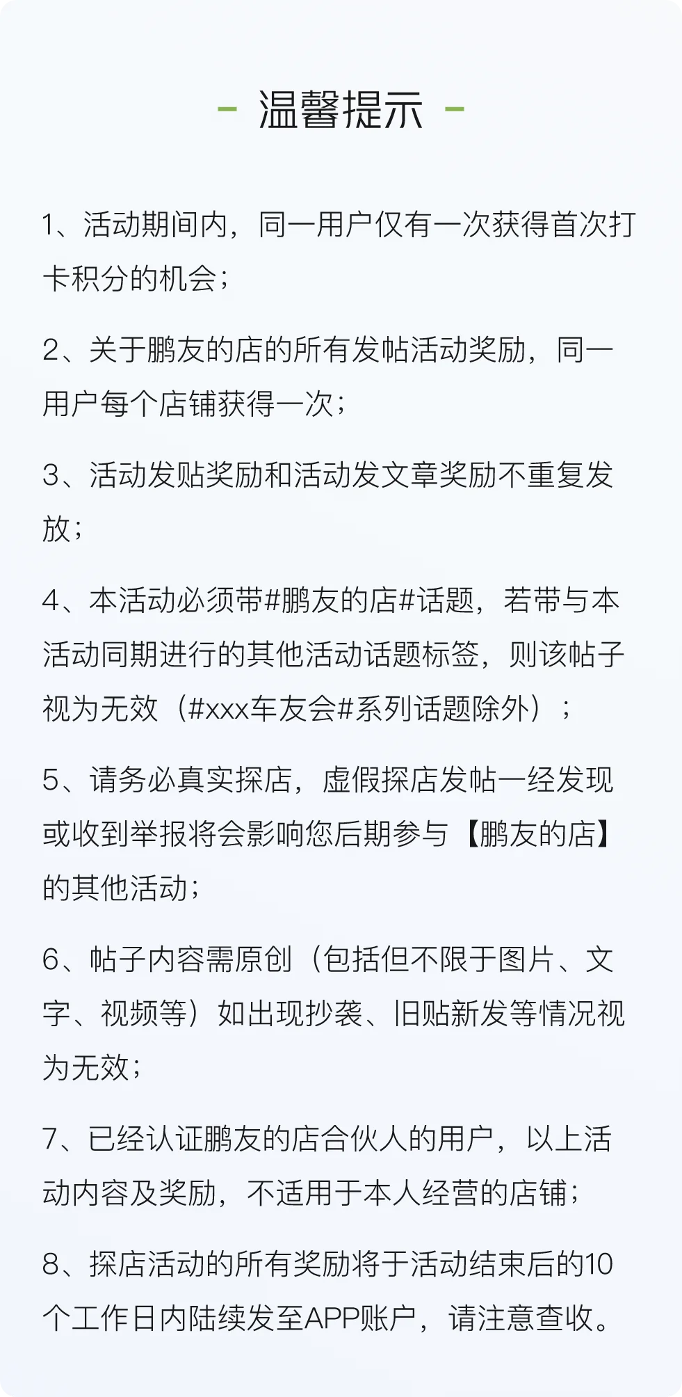 1. 在任意鹏友的店消费扫码签到,并带话题#鹏友的店#发帖分享打卡店铺,需露出鹏友的店元素(认证证书或手举牌)。