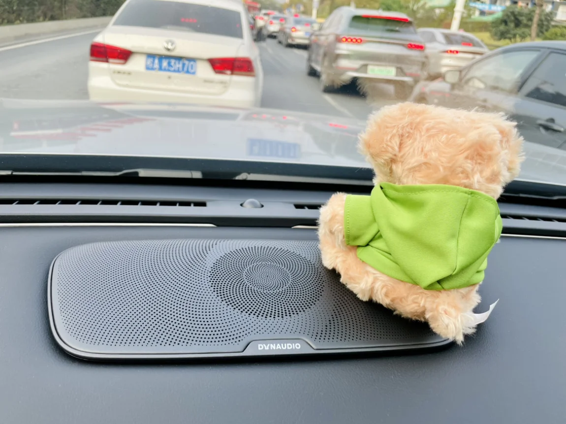 提车时小鹏送的小熊,因为这只特别小,刚好可以放在车头也不遮挡视野,所以就放了上去,也算一些标志物,绿色衣服也很阳光。