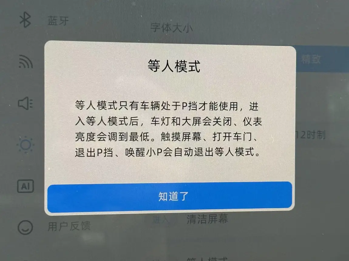 对我来说就是,在一个人充电/需要休息的时候,直接进入等人模式,然后车灯及大屏主动关闭,仪表亮度调至最低,直接休息,美滋滋
