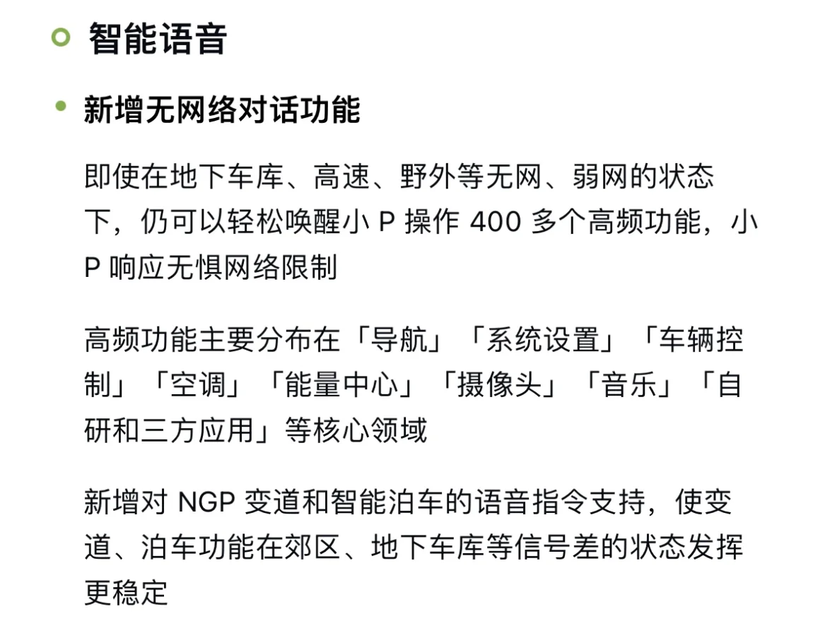 在地下车库、高速等无网或网络不稳定状态下,可实现唤醒小P执行400多个高频功能。这绝对是本次升级亮点之一的最实用功能了,之前经常在高速路和地下车库上遭受到“当前网络不稳定,请稍后再试试吧”的尴尬语音回复,这么聪明智慧的小P不应该受到如此虐待,本次更新终于让小P摆脱枷锁,勇往直前啦!💪