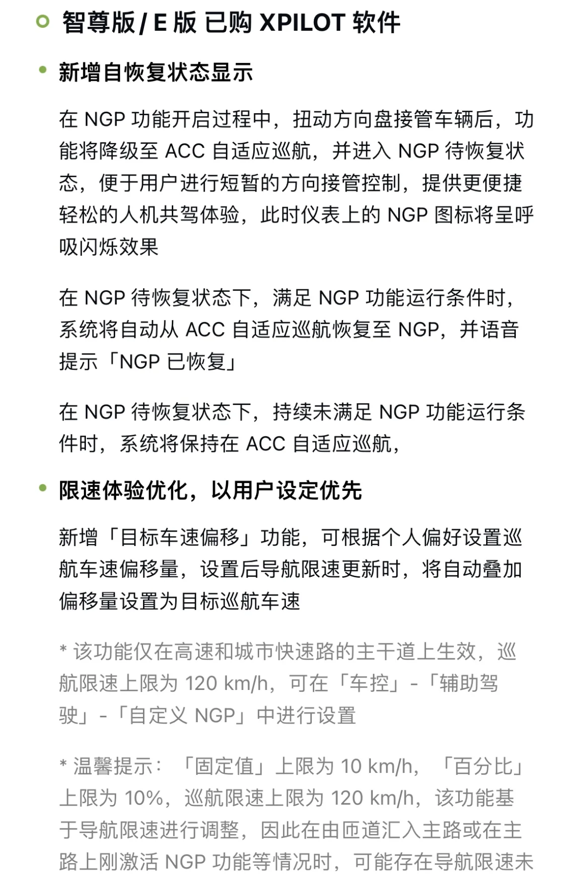 还有已购XPILOT软件的E版优化NGP自行恢复状态和新增“目标车速偏移值”功能,还没上高速去体验呢,待我深入体验了第一时间分享给大家哈!
