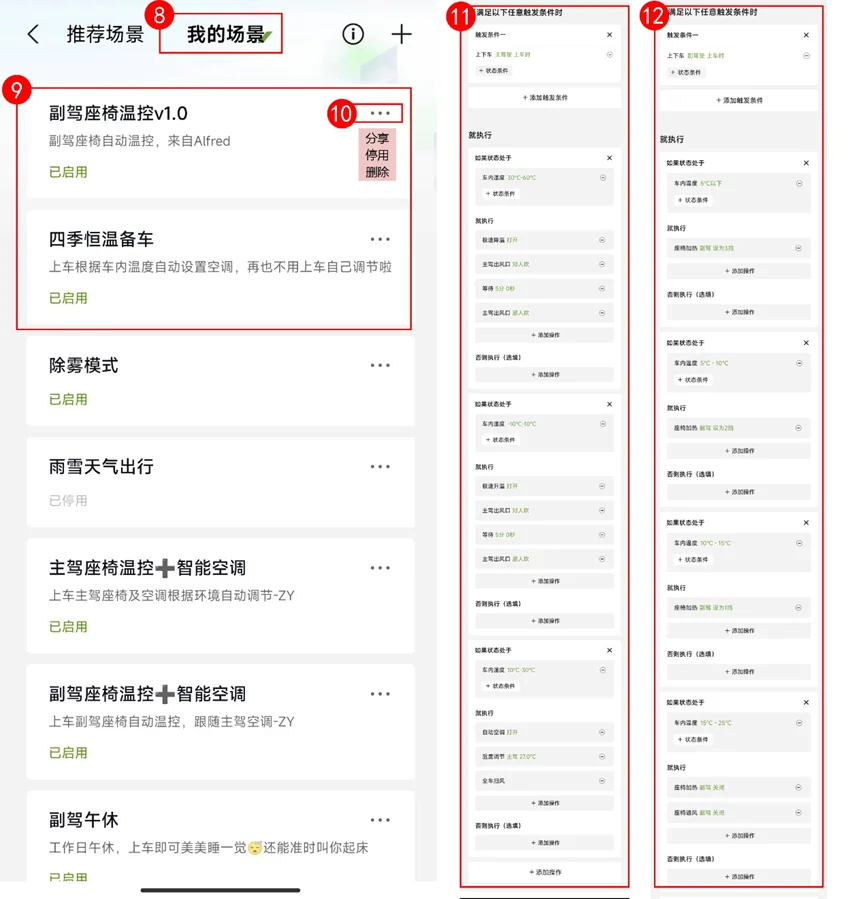下面介绍场景如何个性化更改:选择两个推荐场景查看(⭐5),四季恒温备车和副驾座椅温控 V1.0 (感谢分享人工程师小姐姐和 Alfred ),发现这两个场景触发条件相似(⭐6),都是根据车内温度自动调节环境舒适度,一个控制空调一个控制座椅,能不能把它俩融合呢,于是先把两个推荐均加入我的场景中,方便后期查看和编辑(⭐7),修改试验开始。