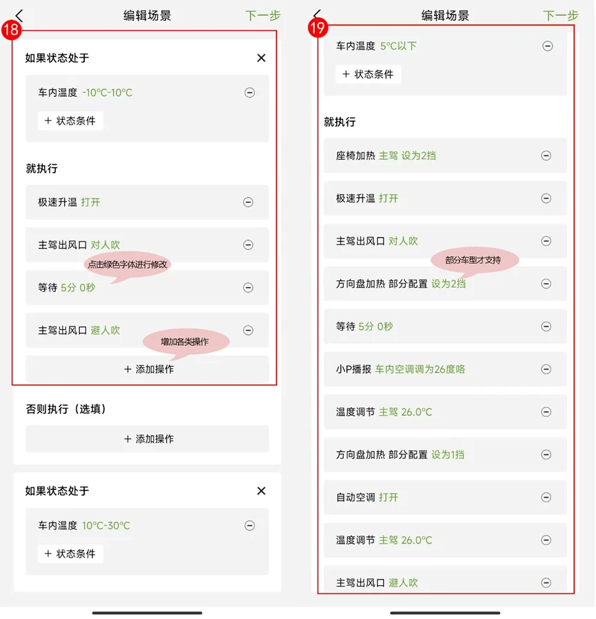 看看原来四季恒温备车的场景(-10°--10°)(⭐18) 和修改融合后的场景(5°以下)对比 (⭐19) ,增加了座椅加热、方向盘加热、5分钟后空调变化等场景。