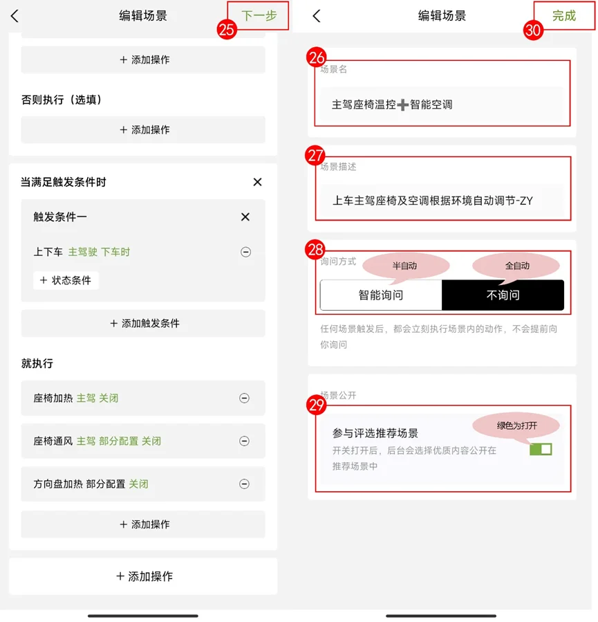 收尾阶段,是给自己的智慧场景取个好听的名字,给一段简短的场景描述,根据提示就能完成主驾的智慧场景设置了(⭐25-30)