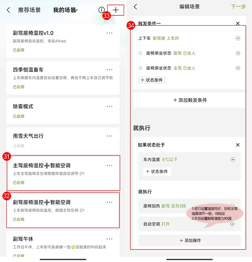 根据上述设置,可以分别给自己的主驾和副驾都进行温控及座椅设置(⭐31)(⭐32),点击 + 就能创建了(⭐33),将原有的触发条件改为副驾上车的情景,如果设置过副驾温度同步的, 理论上空调不用再次设置了,会跟随主驾的情况变动(⭐34)。