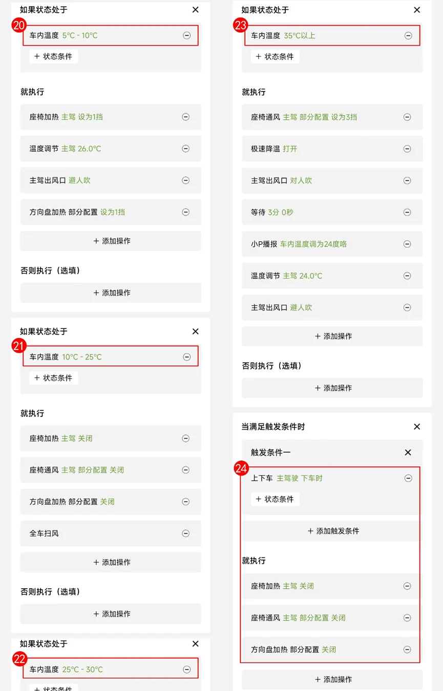 再补个小彩蛋,后面场景又新增氛围灯随温度的变化而变化(⭐A1),还有当室内温度降到正常温度后,相关的设置能够进行自动调整——如果状态处于15°C-25°C为上车时的第一次判断(⭐A2),就在最后部分加上当满足触发条件时的二次判断(⭐A3),理论上能够实现15°C-25°C范围外场景的受空调干预后的自动变更,但部分还没机会测试,后续慢慢完善中~