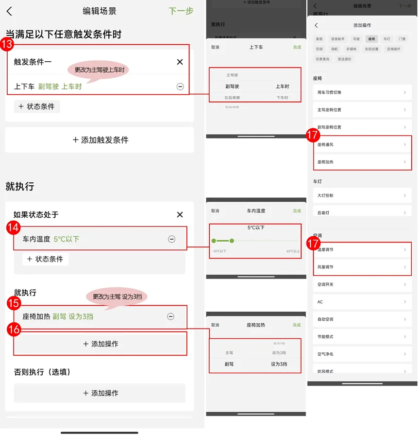 注意看第一个条件“车内温度 5 °C以下”时(⭐14),触发了一个选择分支点(后续还有 5 °C— 15 °C, 15 °C— 25 °C,……, 35°C 以上等多种场景可选,温度可根据自身情况调节,确保覆盖所有的温度范围)(⭐14)即可,点击座椅加热“副驾 设为 3 挡”(⭐15),更改为“主驾 设为 3 挡”即可,同时我们需要将另一个场景的空调设置加进来,点击添加操作 (⭐16) ,弹出最右侧如图新的界面,根据主要想修改的空调及座椅通风加热、方向盘加热等内容,选择相应的场景及条件进行修改 (⭐17)。