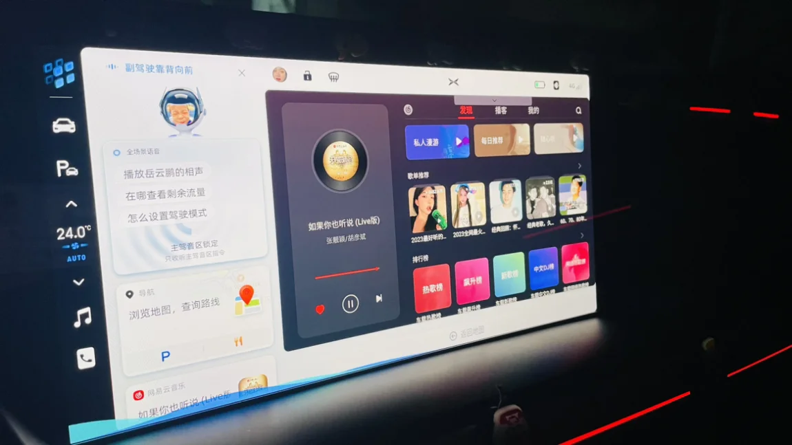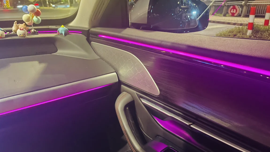 行车时氛围灯效果优化,若开启「行车时开启前挡风氛围灯」开关,行车时扬声器、前挡风氛围灯及四门扣手氛围灯可常亮,营造更好的驾乘体验