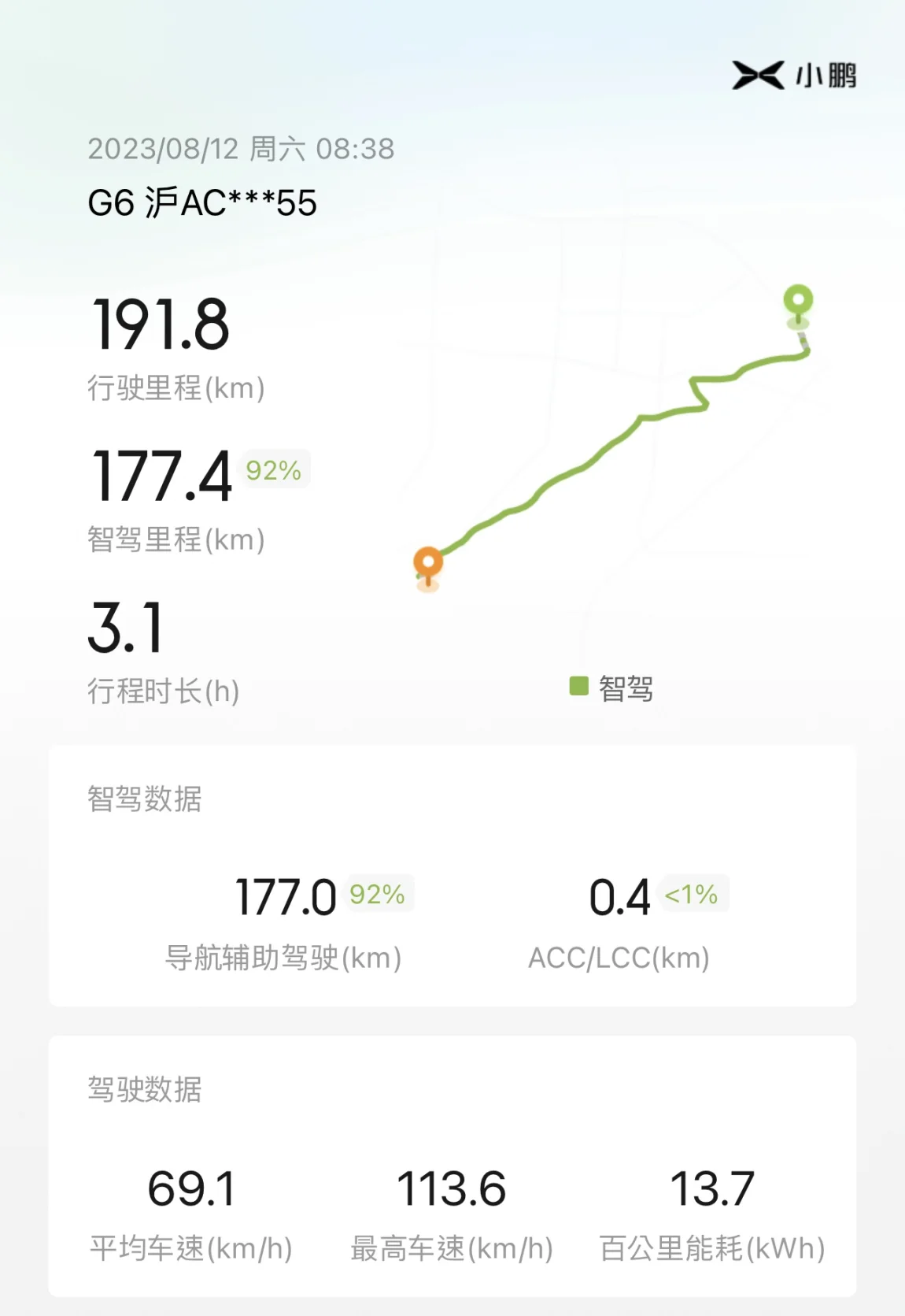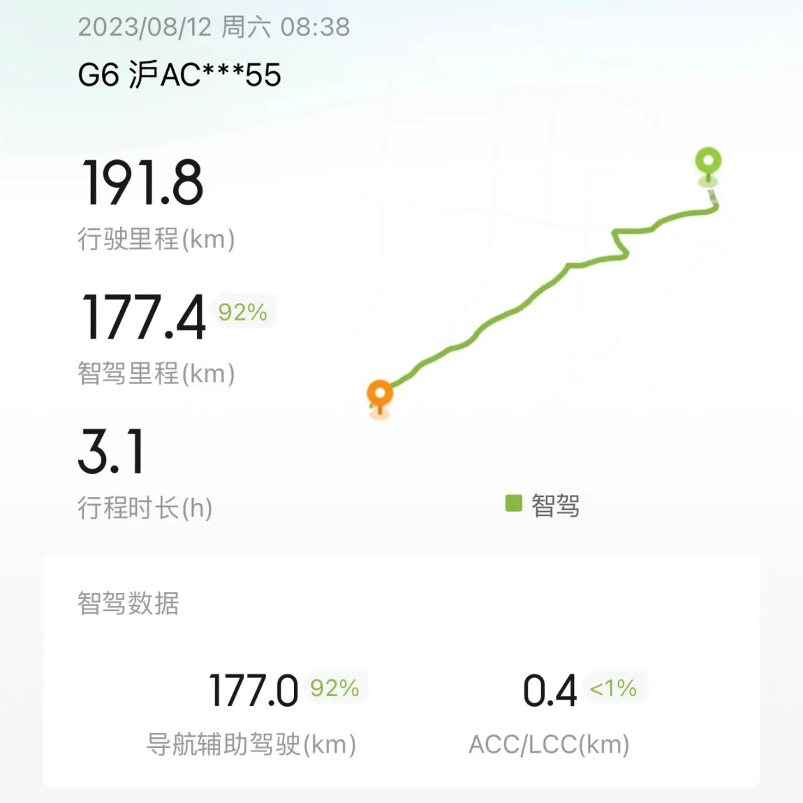 从上海到杭州,191公里中有177公里都是小智(智能辅助驾驶)来完成,其中有一段碰上高速交通事故堵车,走走停停也很舒服。
