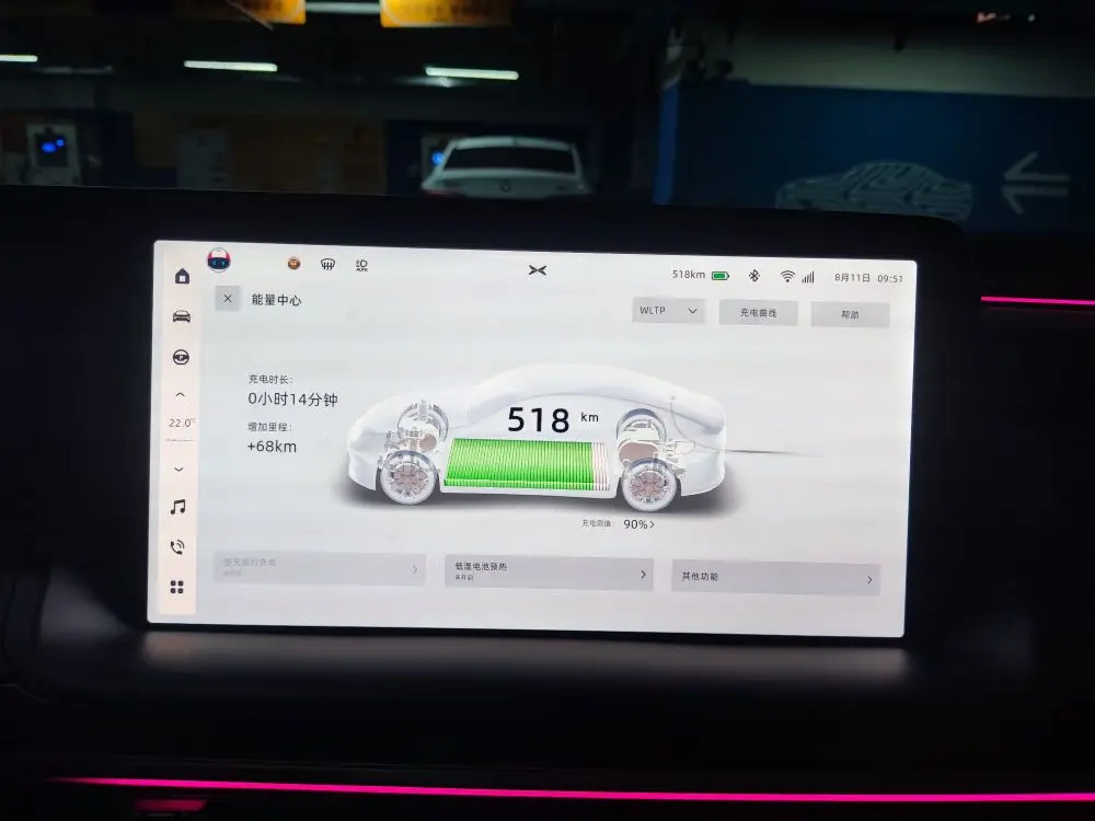 p7i单电机版全系都是702km cltc标准的三元锂电池,90%的日常充电的话可以到518km wltp,使用下来我基本上是1:1的实现率,真的够用完全不焦虑,因为没选1500度电卡,所以都是在外面充的电,120kw的桩子基本可以跑满90kw,充电在40分钟左右就可以全部充满,车上刷刷b站,刷刷手机一下子,吹着空调,或者去吃个饭,非常舒服,这点体验还真的可以