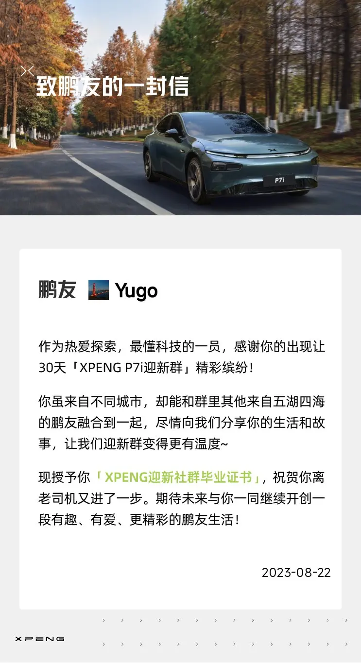 #迎新社群# @鹏友迎新群小助手 提车不知不觉也有30天了,如果给p7i的驾乘打个分,我觉得可以打99分,1分避免骄傲!