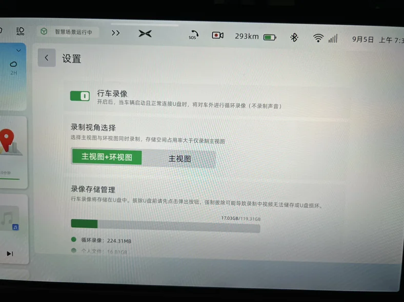 行车记录仪设置界面:1⃣️支持打开或者关闭。2⃣️支持视角选择3⃣️可以查看剩余内存大小(不影响U盘内歌曲的播放)