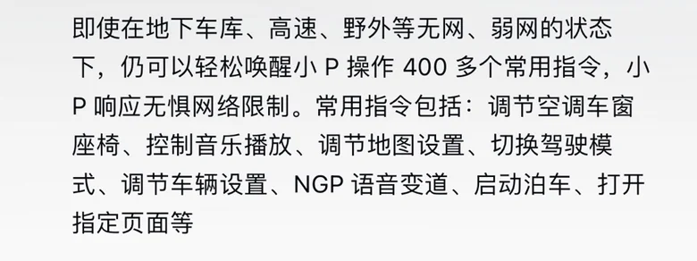 8月更新OTA增加了新的无网络对话语音系统,我们不论是在高速、地下车库、信号弱的地方时,都可以正常的和小P对话对小P发出常态指令。