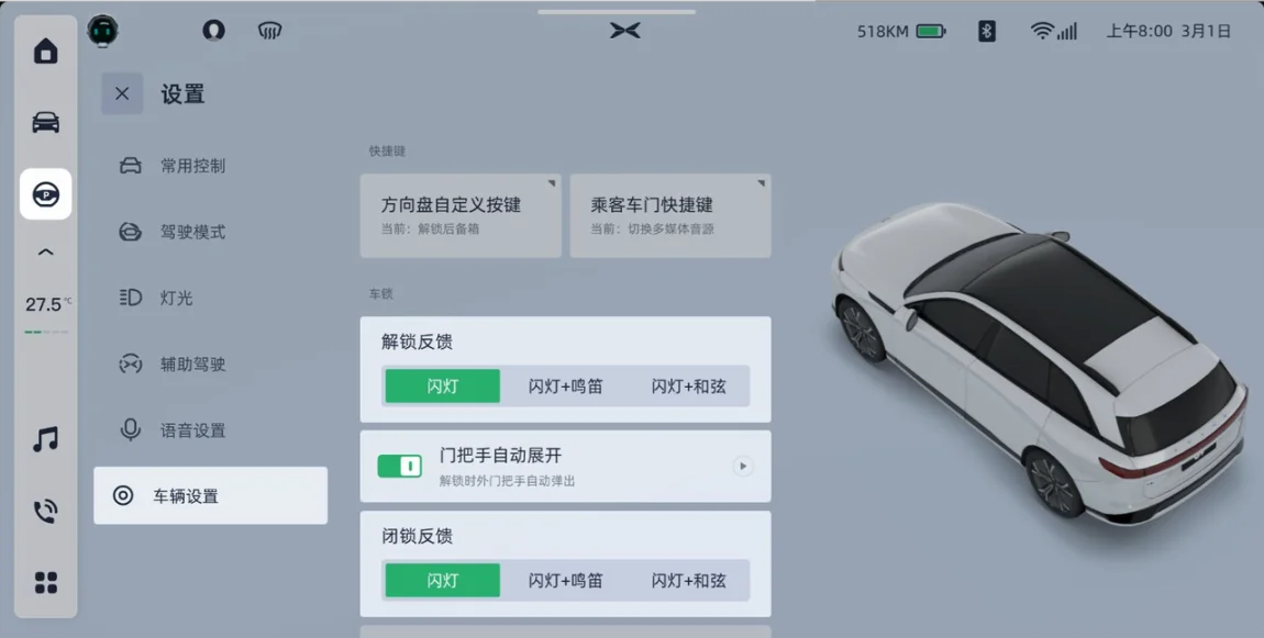 - 大屏新增「解锁反馈」「闭锁反馈」设置,可在大屏「设置」-「车辆设置」-「车锁」内自主选择解锁、闭锁时的车身反馈「闪灯」/「闪灯+鸣笛」/「闪灯+和弦」