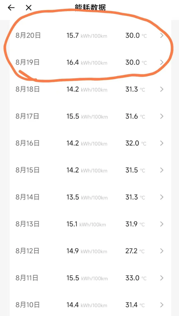 近2个月下来,日均33-35°最高温的天气,结合我平日多高架、多高速的驾驶路况,即使是喜欢超车(起床困难户、早晨送完孩子上学真的要开运动模式和时间赛跑,呜呜┭┮﹏┭┮)、经常顶着限速的我,日常的驾驶能耗基本在13-15.5区间,即使有两天是满人满载全程跑了几百公里的高速,G6的能耗也从未超过17kwh(附图)。所以,在全系800V的加持之下,即使是磷酸铁锂电池的580版本,G6的能耗也可谓是稳扎稳打!即使是多高速高架的路况,WLTP续航100%达成率也是不在话下。