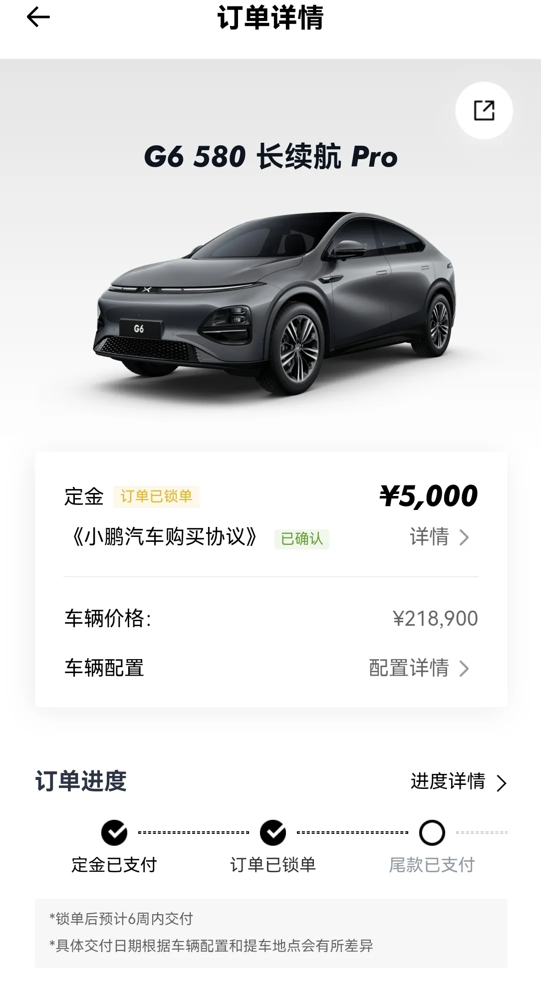 驾照已经有10年了,一只开的燃油车,以前对新能源汽车还有有一点担心(电池成熟度、续航、补电等等的担心),但在7月份了解到小鹏G6,真的让我觉得新能源技术成熟了(前后一体式铝压铸、电磁车身一体化、800V等技术),而且价钱、空间、颜值、科技等各方面都符合我对换新车的要求,也没去对比其他品牌车型,直接就是附近的体验店试驾了。