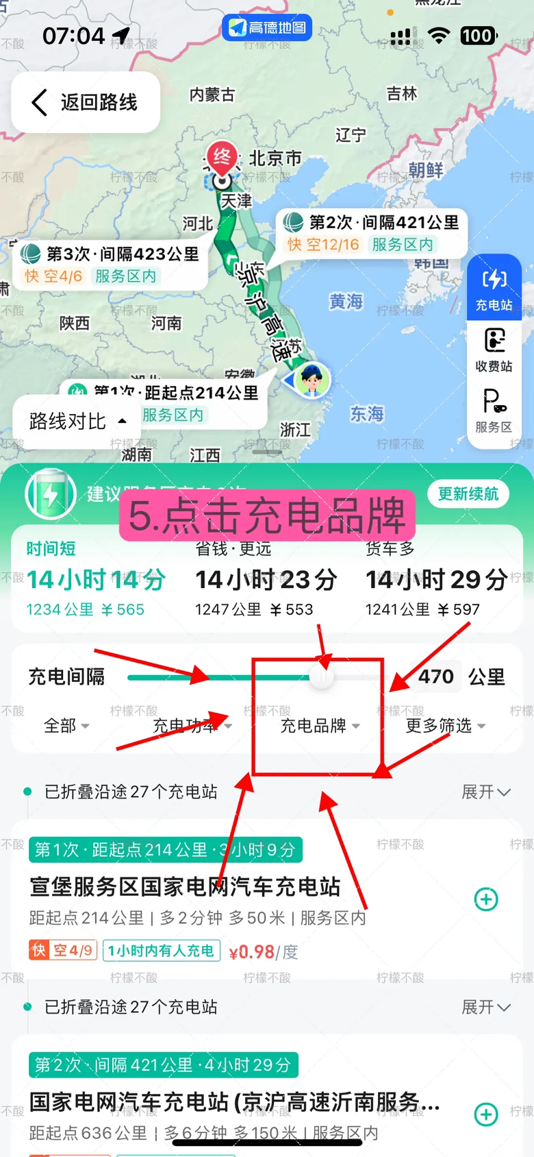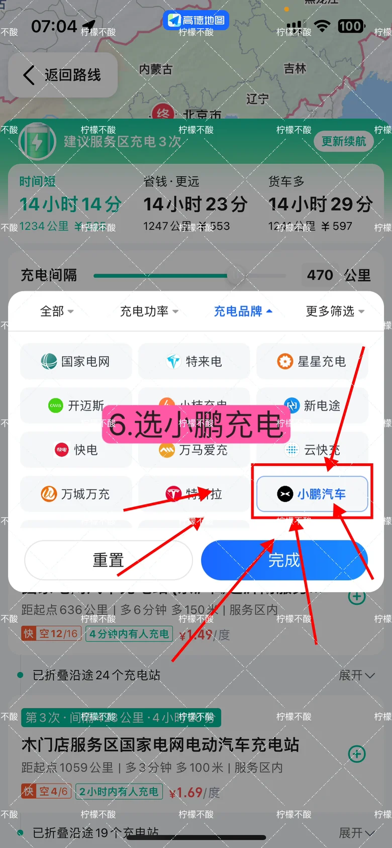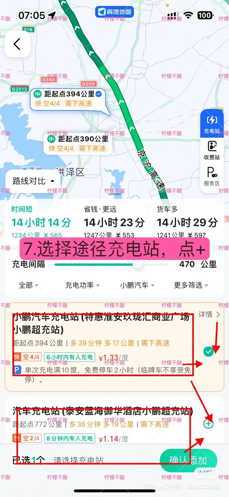 第七步:增加站点为途径点,一般如果你开g6、g9、p7i这几款的话,建议300-400公里加一个站,如果开小鹏其他车型,可以200-300公里选一个站,也可以100-200一个站都加上,如果路过看见很空闲又累了就顺便一充。主打一个随性!