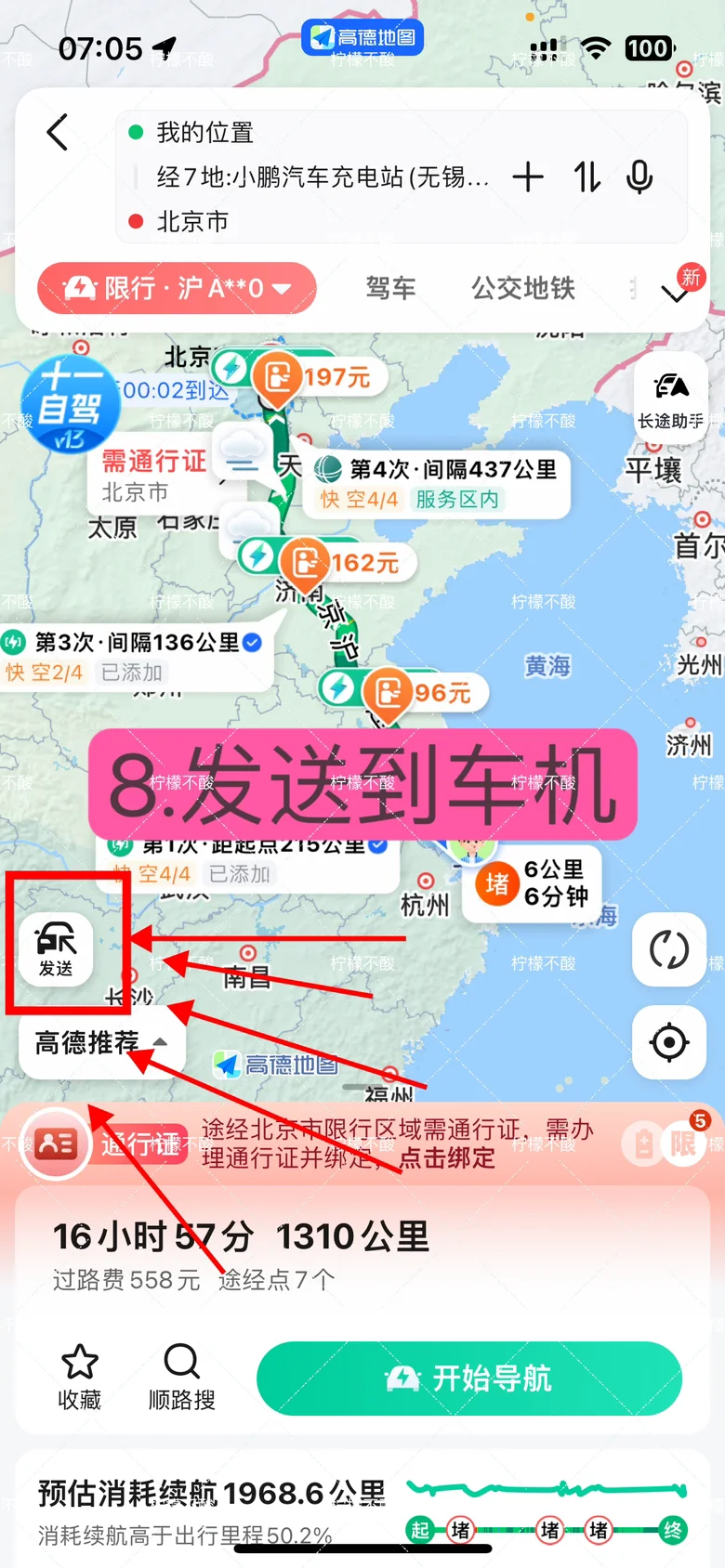 第八步:发送导航路线到车机,这里好像有个小问题,如果途径点超过3个,车机就接收不了了。这个问题我会反映给小鹏。不过除了超远距离比如1500公里这种,大家也很少出现三个途径点的情况。
