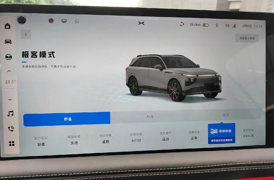 🌹6、极客模式下,其实就是自定义模式,我非常喜欢。这个模式下,车辆的转向力度、动力配比、动能回收怠速、悬架高度、软硬度都由鹏友们自己DIY、你可以自己探索最舒服最喜欢的驾驶模式。