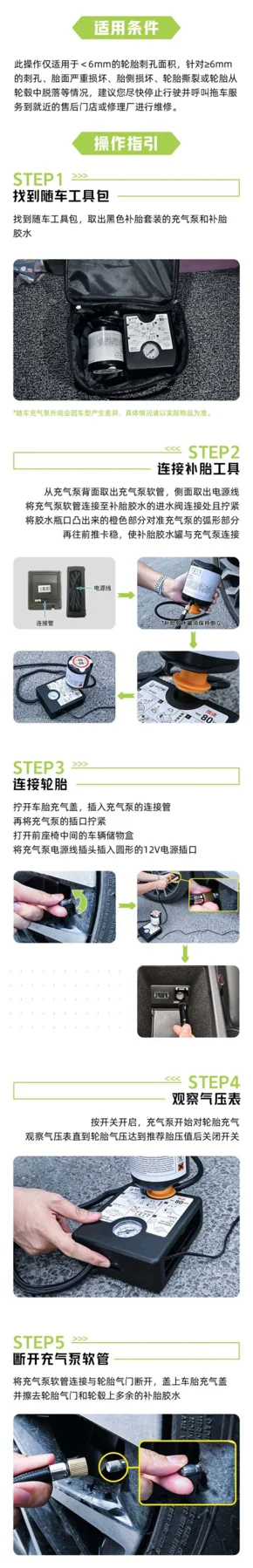 此操作仅适用于<6mm的轮胎刺孔面积,针对≥6mm的刺孔、胎面严重损坏、胎侧损坏、轮胎撕裂或轮胎从轮毂中脱落等情况,建议您尽快停止行驶并呼叫拖车服务到就近的售后门店或修理厂进行维修。